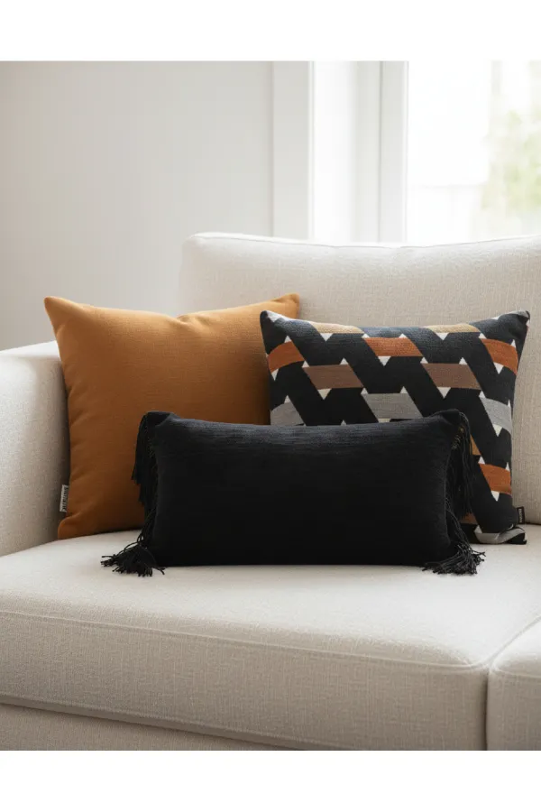 Urban Contrast 3lu Dekoratif Kirlent Seti modern ve cesur dekorasyonu bir araya getirerek yasam alanlarina karakterli bir gorunum kazandirir. Set iceriginde 1 adet duz kare kirlent 45x45 cm, 1 adet geometrik desenli kare kirlent 45x45 cm ve 1 adet puskullu dikdortgen kirlent 50x30 cm bulunmaktadir. Farkli dokular ve kontrast renklerin uyumu sayesinde koltuk uzerinde dengeli ve dikkat cekici bir kombin olusturur. Modern ve urban stil dekorasyonlara uyumludur. Salon, oturma odasi ve yatak odasinda rahatlikla kullanilabilir. Hazir kombin set olarak gonderilir ve dekorasyonu zahmetsiz sekilde tamamlar.